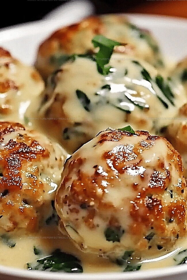 Hearty chicken ricotta meatballs dance in a creamy spinach alfredo sauce, bringing Italian comfort to your dinner table. Parmesan-crusted and packed with flavor, these tender morsels will make you crave seconds at first bite.