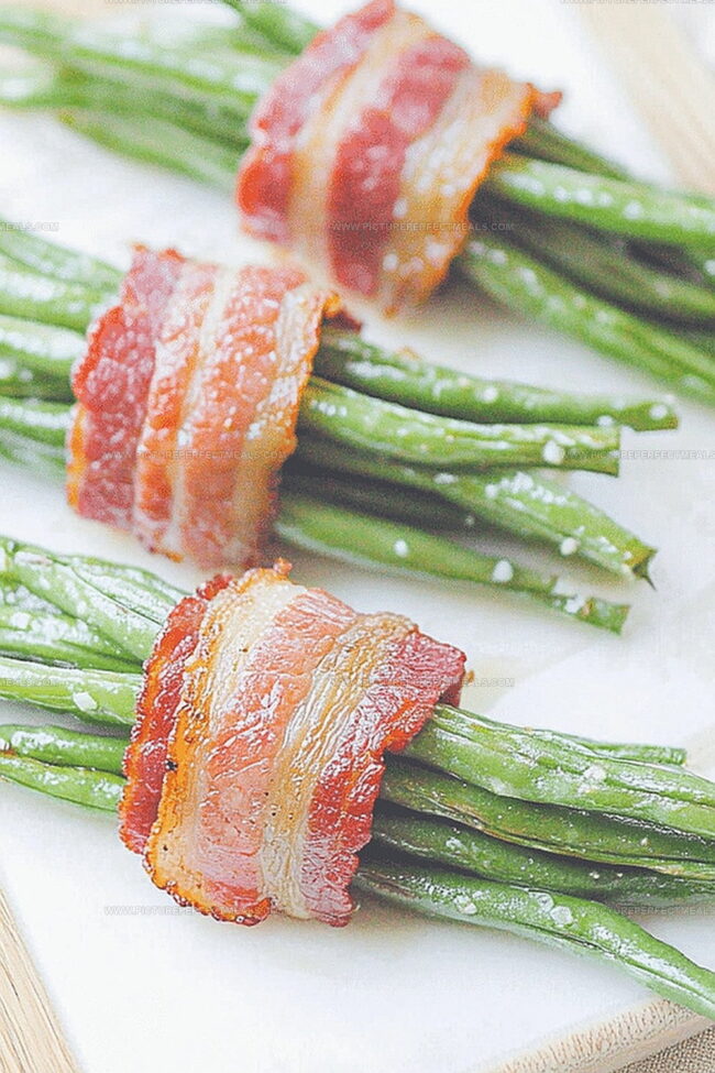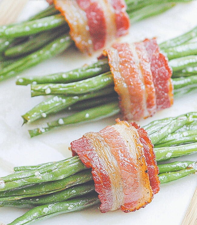 Tender green beans find their perfect match in crispy bacon wrapped deliciously around each slender stalk.