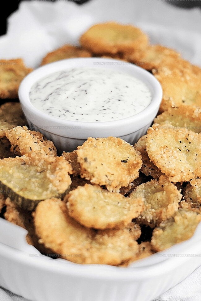 Place crispy pickles on a serving plate and pair with ranch dressing or your favorite dipping sauce for a delightful snack that’ll make taste buds dance.