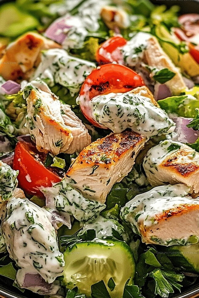 Tender grilled chicken mingles with crisp vegetables and creamy tzatziki, creating a Mediterranean-inspired dish that sings with freshness.