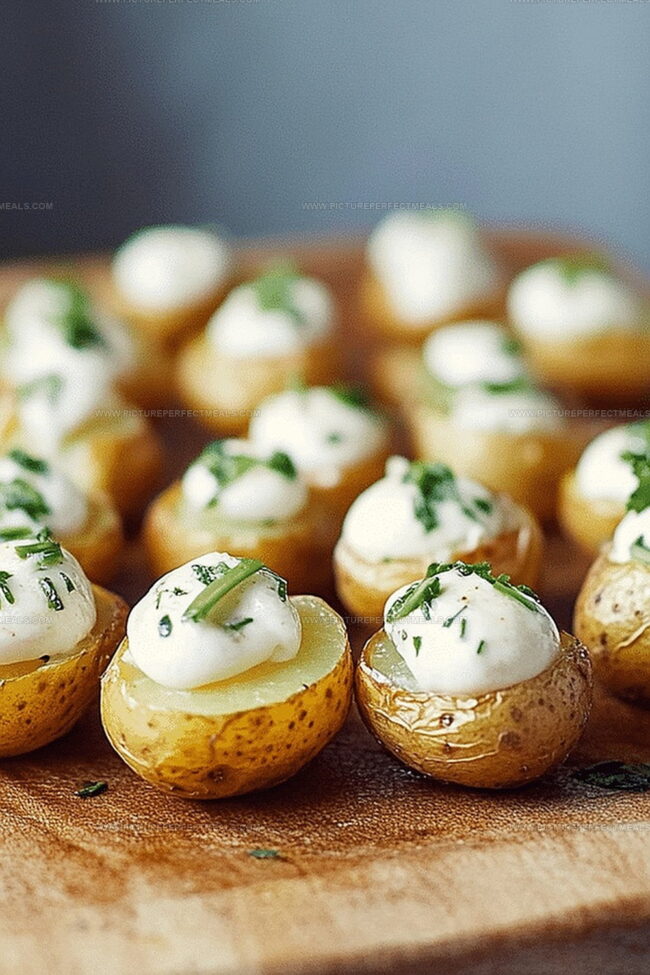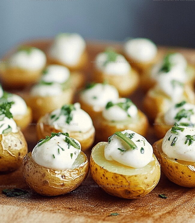 Crown your mini potatoes with dollops of cool sour cream, crispy bacon bits, and a sprinkle of fresh green onions. Garnish with a handful of chopped parsley or chives for a pop of color.