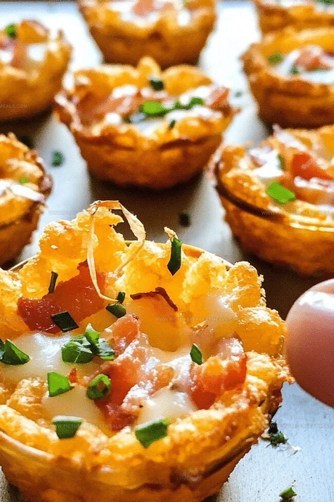 Crispy tater tot appetizer cups bring party-perfect bite-sized delights to your table. Cheesy, savory mini potato baskets pack rich flavor for quick entertaining with friends.