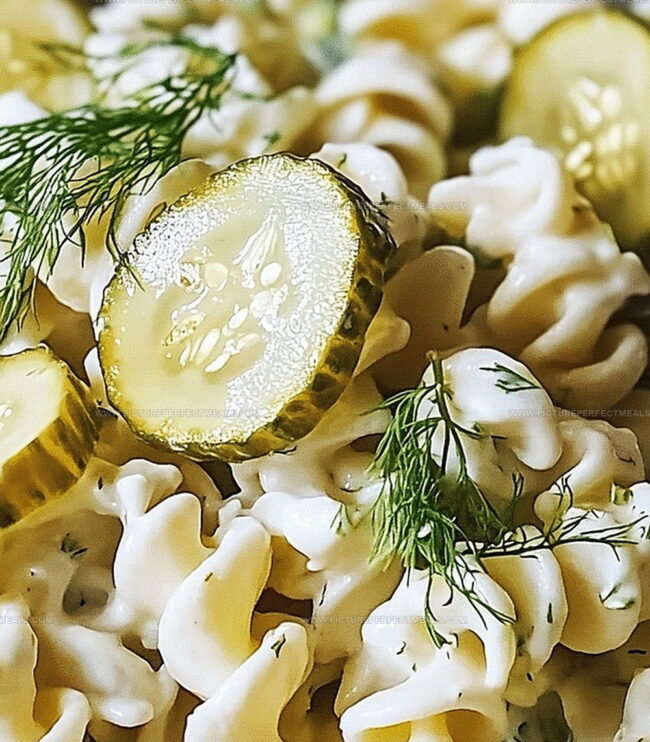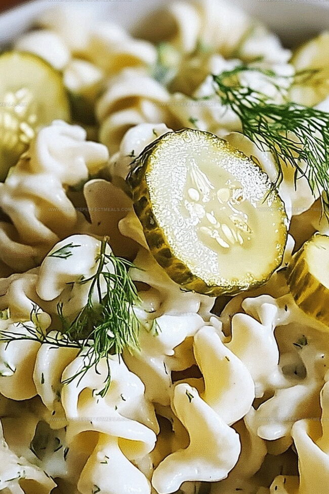 Crisp cucumber chunks and zesty dill pickles create a refreshing twist on traditional pasta recipes.