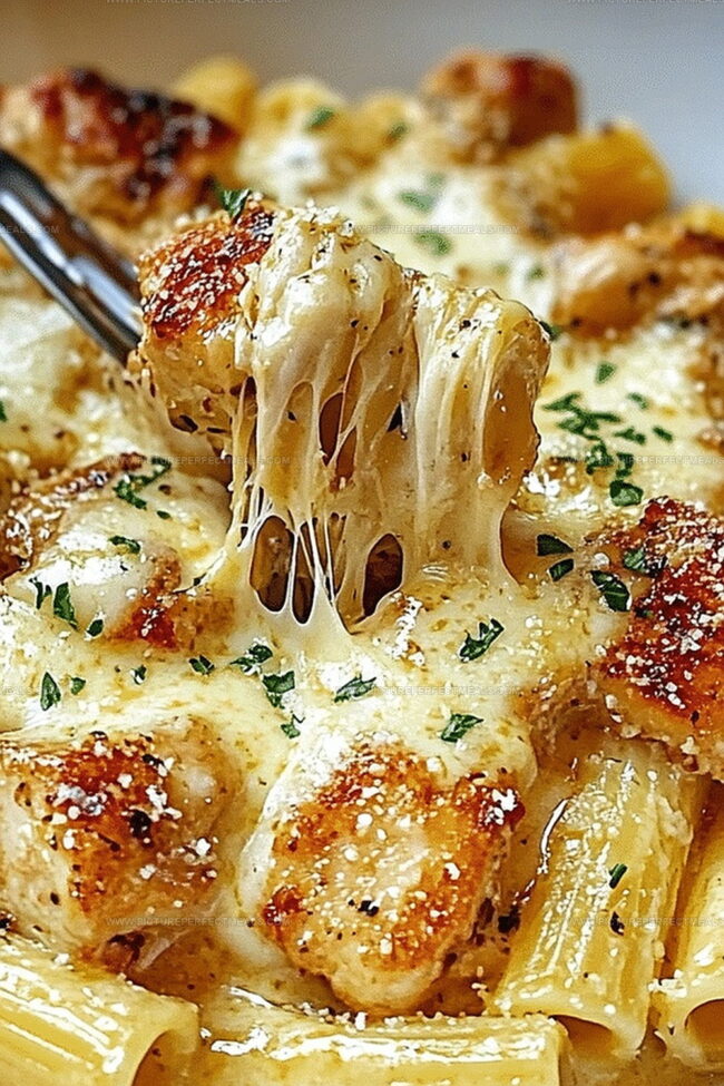 Creamy, rich textures blend seamlessly with tender chicken pieces nestled among perfectly cooked pasta.
