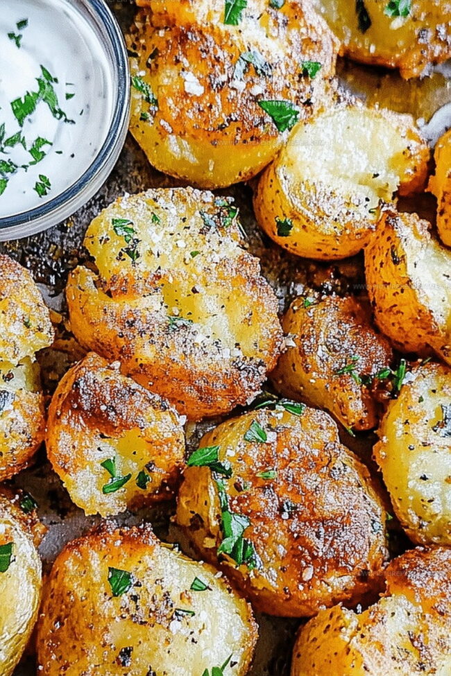 Remove potatoes from the oven and transfer to a serving platter. Top with fresh chopped herbs like parsley or chives. Serve immediately while they’re hot and crispy, perfect as a side dish or appetizer.
