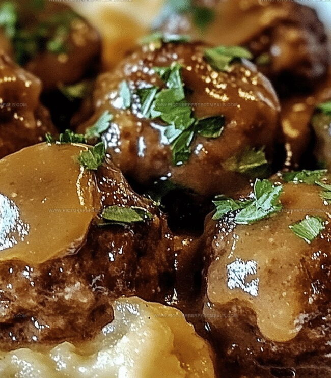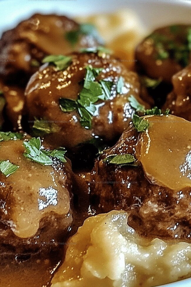 Cozy Dinner Centerpiece: Serve these French onion meatballs as a delightful main course over creamy mashed potatoes, allowing the rich sauce to soak into each fluffy bite.