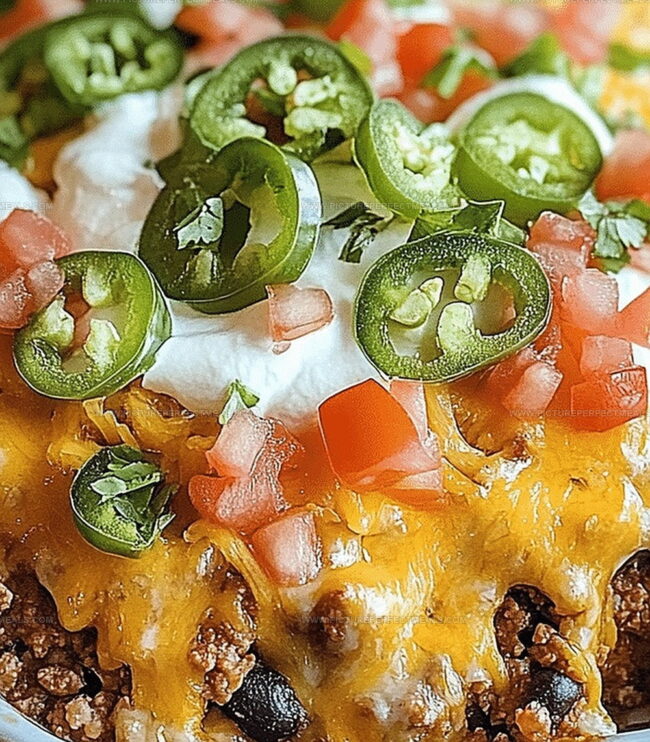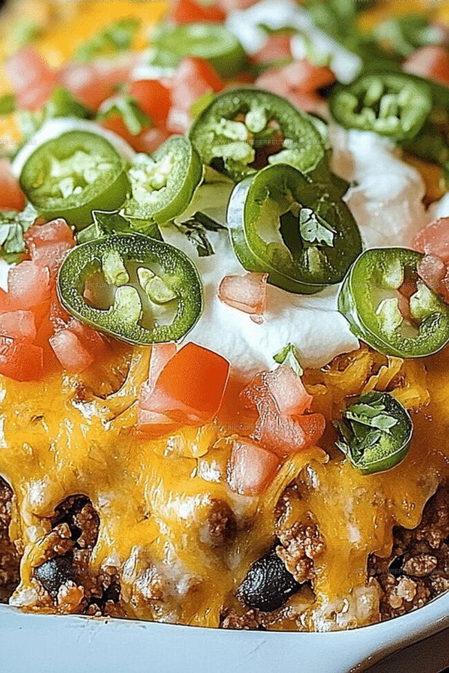 Layers of seasoned ground beef create a delicious taco casserole that promises pure culinary satisfaction.