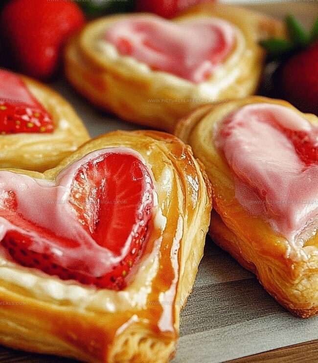 Romantic strawberry cream cheese heart danishes combine flaky pastry with luscious cream cheese and fresh strawberries. Sweet European-style pastries melt in your mouth, offering a delightful treat perfect for special occasions or weekend baking adventures.