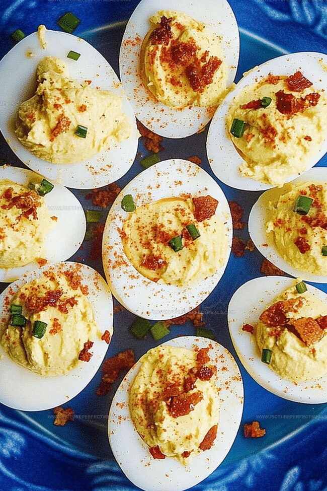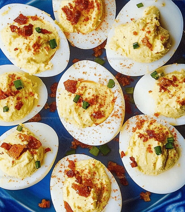 - Elegant Assembly: Pipe or spoon the creamy yolk mixture into egg white cavities, forming elegant peaks. Garnish with a delicate dusting of paprika and crispy bacon bits to elevate visual and flavor profiles.