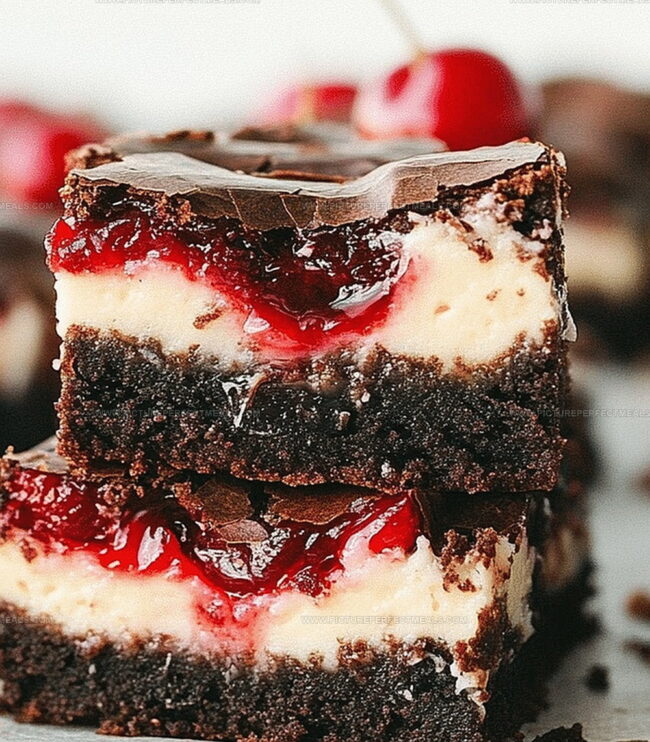 Luscious cherry cheesecake brownies blend rich chocolate with tangy cream cheese and sweet cherry swirls. Classic dessert layers create irresistible flavor combinations that will delight chocolate and cheesecake enthusiasts.