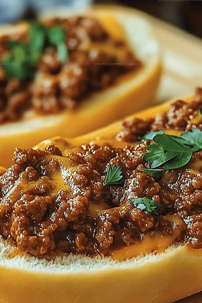 Melted cheese and savory ground beef create a hearty filling that nestles perfectly between soft, toasted bread.
