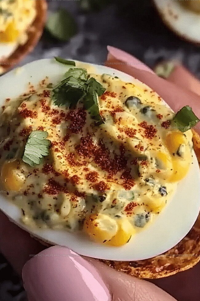 Corn: Sweet corn kernels add a traditional Mexican street food element and delightful texture to the deviled eggs.