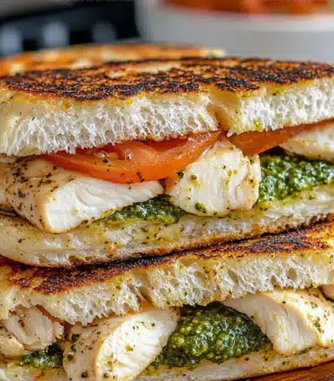 Gourmet chicken pesto sandwich promises a flavor explosion from Mediterranean kitchens. Crisp bread, succulent chicken, and aromatic basil pesto create a perfect lunch companion you’ll crave again and again.