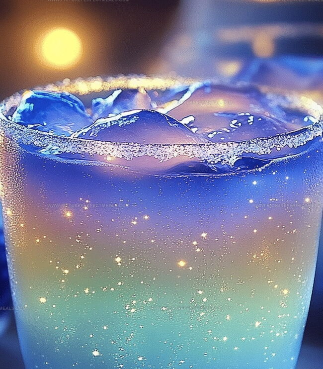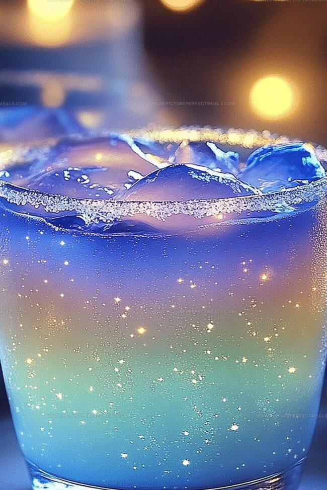 Midnight blue liqueurs and sparkling ingredients dance together like starry sky performers.