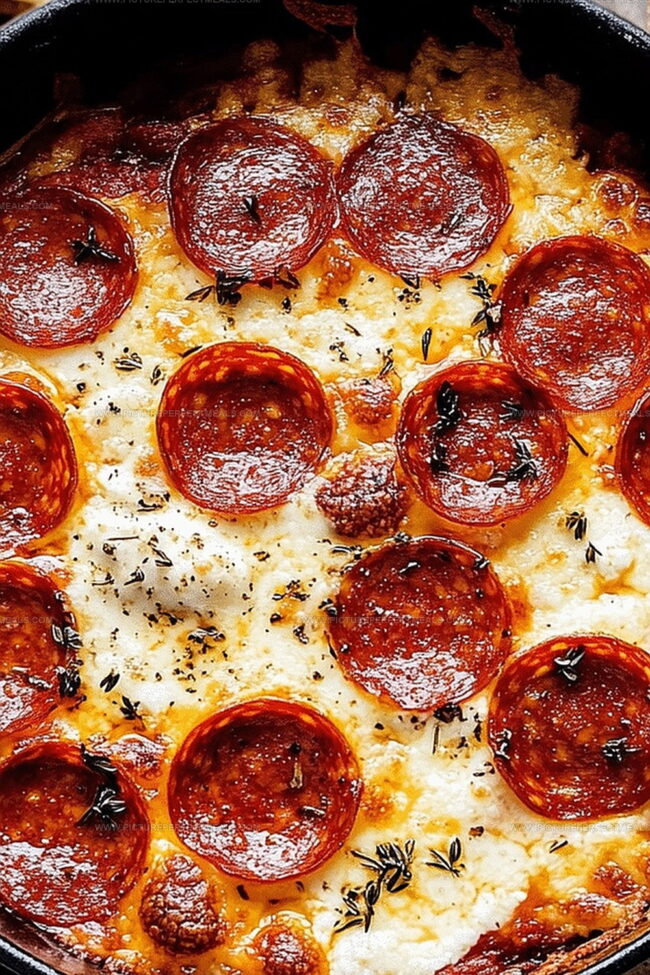 Slide the dish into the preheated oven. Bake for 15-20 minutes until the edges start to bubble and the pepperoni edges become slightly crispy.