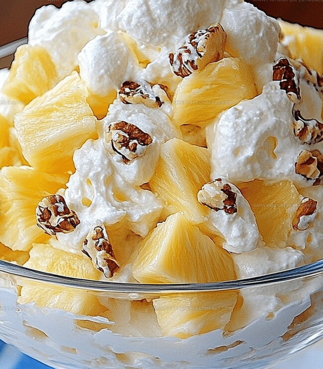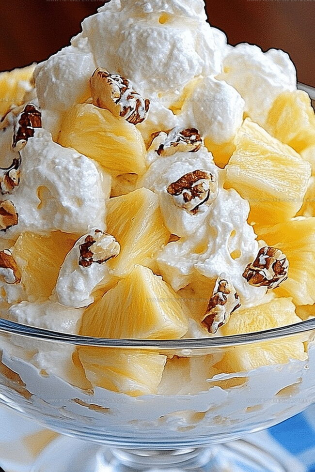 Creamy pineapple fluff salad whispers sweet memories of summer potlucks and lazy afternoons.