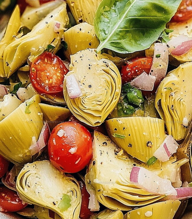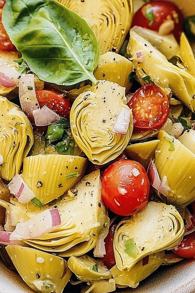 Tender artichoke hearts dance with crisp greens and zesty herbs in a delightful Mediterranean medley.