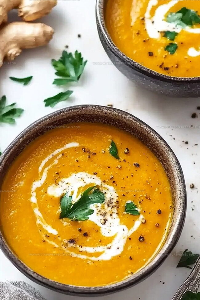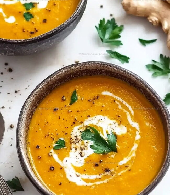 Golden Comfort Bowl: Serve this vibrant soup in deep ceramic bowls that highlight its rich orange color, creating a warm and inviting presentation perfect for cozy evenings.